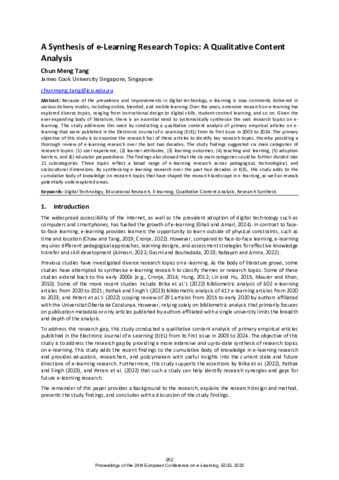 Tang, Chun Meng (2025) A Synthesis of e-Learning Research Topics: A Qualitative Content Analysis. In: Proceedings of the 24th European Conference on e-Learning. pp. 262-270. From: 24th European Conference on e-Learning, 23-24 October 2025, Copenhagen, Denmark.