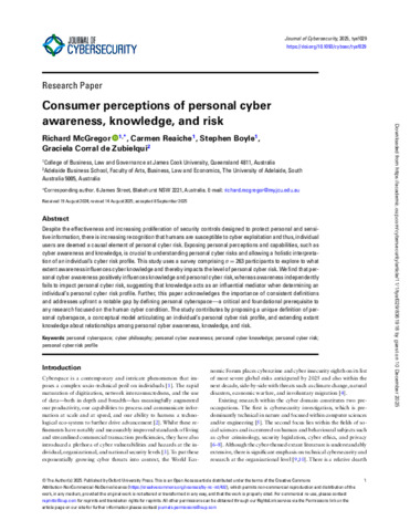 McGregor, Richard, Reaiche, Carmen, Boyle, Stephen, and Correal de Zubielqui, Graciela (2025) Consumer perceptions of personal cyber awareness, knowledge, and risk. Journal of Cybersecurity, 11 (1). tyaf029.