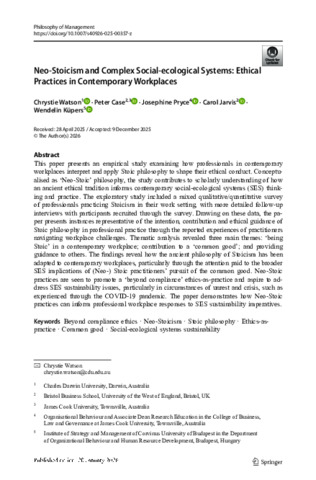 Watson, Chrystie, Case, Peter, Pryce, Josephine, Jarvis, Carol, and Küpers, Wendelin (2026) Neo-Stoicism and Complex Social-ecological Systems: Ethical Practices in Contemporary Workplaces. Philosophy of Management. (In Press)