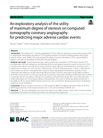 Faulder, Thomas, Prematunga, Shiromi, Moloi, Soniah, and Moxon, Joseph (2025) An exploratory analysis of the utility of maximum degree of stenosis on computed tomography coronary angiography for predicting major adverse cardiac events. BMC Medical Imaging, 25. 483.