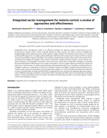 Otolorin, Gbeminiyi R., Castellanos, María E., Adegboye, Oyelola A., and McBryde, Emma S. (2025) Integrated vector management for malaria control: a review of approaches and effectiveness. Transactions of the Royal Society of Tropical Medicine and Hygiene, 119 (11). pp. 1223-1232.