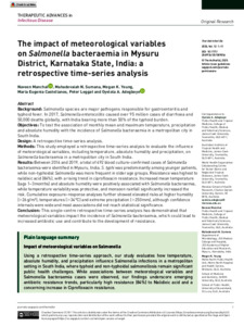 Manchal, Naveen, Sumana, Mahadevaiah N., Young, Megan K., Castellanos, Maria Eugenia, Leggat, Peter, and Adegboye, Oyelola A. (2025) The impact of meteorological variables on Salmonella bacteraemia in Mysuru District, Karnataka State, India: a retrospective time-series analysis. Therapeutic Advances in Infectious Disease, 12. 20499361251389056.