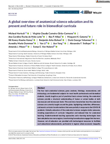 Hortsch, Michael, Girão-Carmona, Virginia Claudia Carneiro, Leite, Ana Caroline Rocha de Melo, Nikas, Ilias P., Gatumu, Margaret K., Koney, Nii Koney Kwaku, Arko-Boham, Benjamin, Yohannan, Doris George, Oommen, Aswathy Maria, Li, Yan, Yang, Jian, Trollope, Alexandra F., Meyer, Amanda J., and Van Nuland, Sonya E. (2025) A global overview of anatomical science education and its present and future role in biomedical curricula. Anatomical Sciences Education, 19 (1). pp. 5-45.