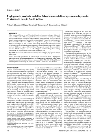 Kann, R., Seddon, J., Kyaw-Tanner, M., Schoeman, J. P., Schoeman, T., and Meers, J. (2006) Phylogenetic analysis to define feline immunodeficiency virus subtypes in 31 domestic cats in South Africa. Journal of the South African Veterinary Association, 77 (3). pp. 108-113.