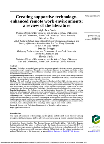 Onnis, Leigh-Ann, Tan, Kim Lim, Morgan, Damian, and Sekhar, Shruthi (2025) Creating supportive technology-enhanced remote work environments: a review of the literature. Personnel Review. (In Press)
