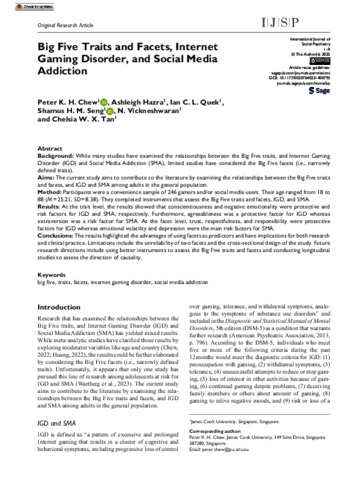 Chew, Peter K.H., Hazra, Ashleigh, Quek, Ian C.L., Seng, Shamus H.M., Vickneshwaran, N., and Tan, Chelsia W.X. (2025) Big five traits and facets, internet gaming disorder, and social media addiction. International Journal of Social Psychiatry. (In Press)
