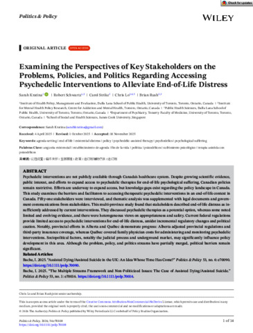 Kratina, Sarah, Schwartz, Robert, Strike, Carol, Lo, Chris, and Rush, Brian (2026) Examining the perspectives of key stakeholders on the problems, policies, and politics regarding accessing psychedelic interventions to alleviate end-of-life distress. Politics & Policy, 54 (1). e70108.