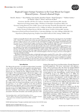 Huston, David L., Mathur, Ryan, Sanislav, Ioan, Cloutier, Jonathan, Champion, David, Lisitsin, Vladimir, Whelan, Jo, Simon, Adam C., and del Real, Irene (2025) Regional Copper Isotope Variations in the Giant Mount Isa Copper Mineral System—Toward a Basinal Origin. Economic Geology, 120 (7). pp. 1735-1750.