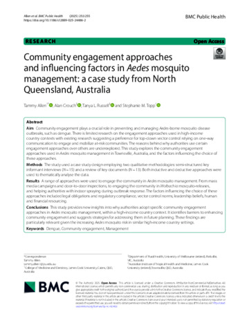 Allen, Tammy, Crouch, Alan, Russell, Tanya L., and Topp, Stephanie M. (2025) Community engagement approaches and influencing factors in Aedes mosquito management: a case study from North Queensland, Australia. BMC Public Health, 25. 3255.