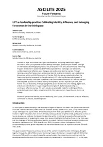 Tyrell, Simone, Cosgrove, Karine, Cook, Helmy, Addanki, Kranthi, and Ngo, Leanne (2025) LIFT as leadership practice: Cultivating identity, influence, and belonging for women in the third space. In: ACILITE 2025 Conference Proceedings. From: ASCILITE 2025: 42nd International Conference on Innovation, Practice and Research in the Use of Educational Technologies in Tertiary Education, 30 November - 3 December 2025, Adelaide, SA, Australia.