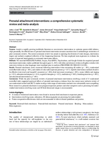 Coté, John J., Dilsaver, Danielle B, Dimmock, James, Doehrman, Pooja, Teague, Samantha, Coté, Remington D., Coté, Brayden, Kilzer, Riley, Sabbaghi, Mahsa Omrani, Borelli, Jessica L., and Massey, Suena H. (2025) Prenatal attachment interventions: a comprehensive systematic review and meta-analysis. Archives of Women's Mental Health, 28. pp. 1447-1471.