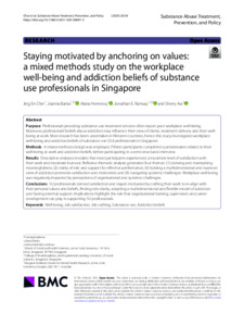 Staying motivated by anchoring on values: a mixed methods study on the workplace well-being and addiction beliefs of substance use professionals in Singapore