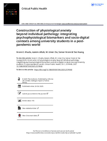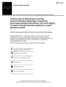 Khudaa, Ikram E., Azeem, Aftab, Zia, M. Umer, Ikram, Samar, and Huang, Tao (2025) Construction of physiological anxiety beyond individual pathology: integrating psychophysiological biomarkers and socio-digital contexts among university students in a postpandemic world. Critical Public Health, 35 (1).