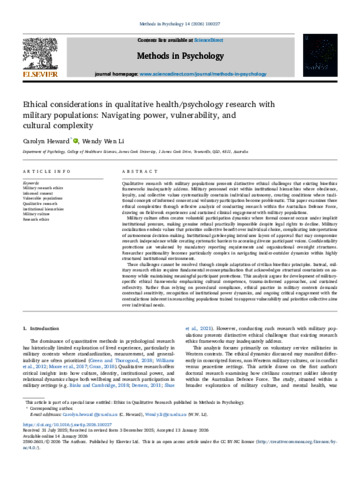 Heward, Carolyn, and Li, Wendy Wen (2026) Ethical considerations in qualitative health/psychology research with military populations: Navigating power, vulnerability, and cultural complexity. Methods in Psychology, 14. 100227.