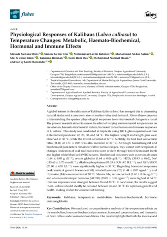 Mimi, Masuda Sultana, Das, Simon Kumar, Rahman, Mohammad Luftar, Salam, Mohammad Abdus, Islam, Md. Nushur, Rahman, Tamanna, Das, Sumi Rani, Hasan, Mohammad Nazmol, and Mazumder, Sabuj Kanti (2026) Physiological Responses of Kalibaus (Labeo calbasu) to Temperature Changes: Metabolic, Haemato-Biochemical, Hormonal and Immune Effects. Fishes, 11 (1). 46.