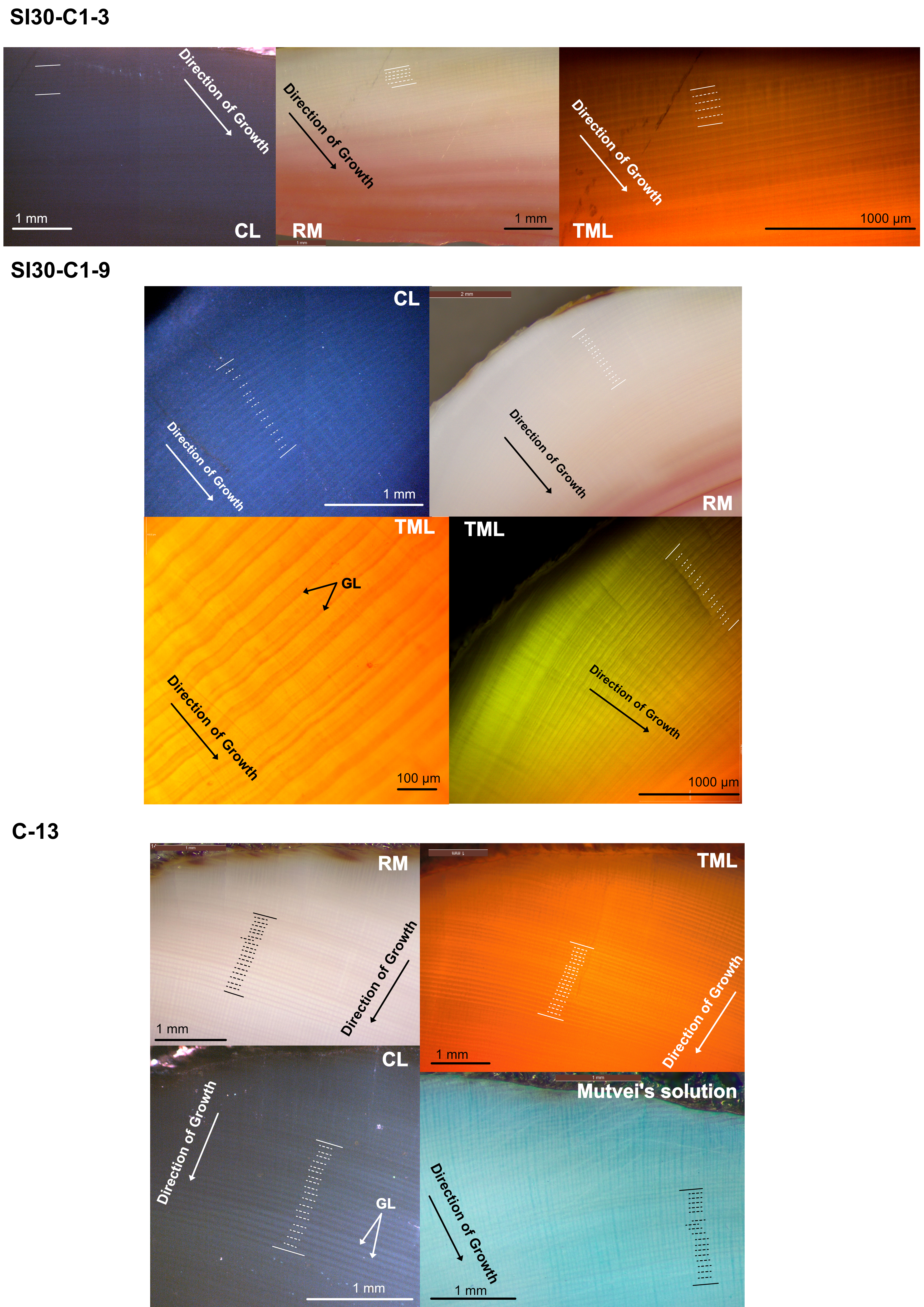 Mutvei's solution is a widely utilized standard staining method for revealing growth increments in biogenic carbonates; however, it is a slightly toxic, destructive approach with varying success across species groups. Therefore, there has been growing interest in finding non-toxic, less destructive, and straightforward alternative techniques for studying growth structures, primarily focusing on long-lived shells. This research focuses on an intertidal short-lived marine gastropod—Conomurex luhuanus, collected from the Great Barrier Reef and a nearby archaeological site. A comparative analysis of common and cost-effective tools used for growth increment visualization—including transmitted-light microscopy, reflected-light microscopy, cathodoluminescence, Raman spectroscopy, and acetate peel against Mutvei's solution—was undertaken to determine the most effective method to visualize daily growth increments in C. luhuanus. Overall, our results suggested that the relative patterns of measuring growth increments using all techniques are broadly consistent (r = 0.4–0.7, p < 0.05) in the absence of slowed or halted growth. However, transmitted-light microscopy (TML) was the only method that revealed more growth increments in an area where growth lines were too thin to be detected using other techniques, making it impossible to distinguish the daily growth increments using those techniques. Transmitted-light microscopy, without staining or thin-sectioning, was an effective and time-efficient technique for visualizing daily growth increments in C. luhuanus. We suggest that TML can be considered as a preliminary step to investigate growth increments in other species before applying established approaches, such as Mutvei's solution.