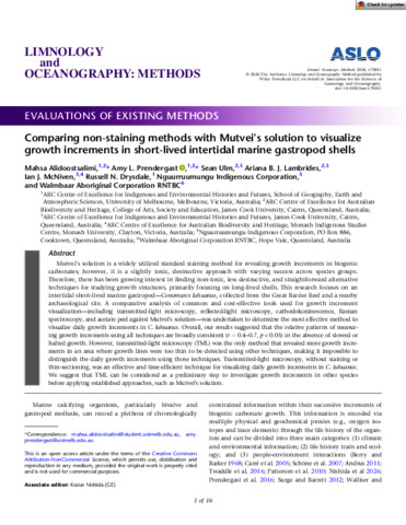 Alidoostsalimi, Mahsa, Prendergast, Amy, Ulm, Sean, Lambrides, Ariana, Mcniven, Ian, Nguurruumungu Indigenous Corporation, Walmbaar Aboriginal Corporation RNTBC, and UNSPECIFIED (2026) Comparing non-staining methods with Mutvei's solution to visualize growth increments in short-lived intertidal marine gastropod shells. Limnology and Oceanography: Methods. e70031. (In Press)