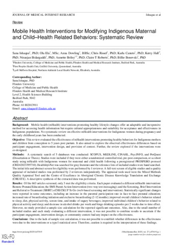 Ishaque, Sana, Ela, Ola, Dowling, Anna, Rissel, Chris, Canuto, Karla, Hall, Kerry, Bidargaddi, Niranjan, Briley, Annette, Roberts, Claire T., and Bonevski, Billie (2025) Mobile Health Interventions for Modifying Indigenous Maternal and Child–Health Related Behaviors: Systematic Review. Journal of Medical Internet Research, 27. e57019.