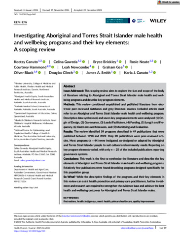 Canuto, Kootsy, Gaweda, Celina, Brickley, Bryce, Neate, Rosie, Hammond, Courtney, Newcombe, Leah, Gee, Graham, Black, Oliver, Clinch, Douglas, Smith, James A., and Canuto, Karla J. (2025) Investigating Aboriginal and Torres Strait Islander male health and wellbeing programs and their key elements: A scoping review. Health Promotion Journal of Australia, 36 (1). e940.