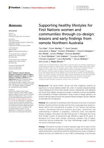 Dias, Tara, MacKay, Diana, Canuto, Karla, Boyle, Jacqueline A., D’Antoine, Heather, Hampton, Denella, Martin, Kim, Phillips, Jessica, Bartlett, Norlisha, McIntyre, H. David, Graham, Sian, Corpus, Sumaria, Connors, Christine, McCarthy, Leisa, Kirkham, Renae, and Maple-brown, Louise J. (2024) Supporting healthy lifestyles for First Nations women and communities through co-design: lessons and early findings from remote Northern Australia. Frontiers in Clinical Diabetes and Healthcare, 5. 1356060.