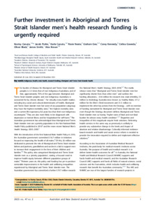 Canuto, Kootsy, Prehn, Jacob, Canuto, Karla, Neate, Rosie, Gee, Graham, Kennedy, Corey, Gaweda, Celina, Black, Oliver, Smith, James, and Brown, Alex (2023) Further investment in Aboriginal and Torres Strait Islander men's health research funding is urgently required. Australian and New Zealand Journal of Public Health, 47 (2). 100025.