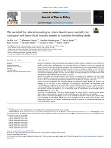 Lew, Jie Bin, Feletto, Eleonora, Worthington, Joachim, Roder, David, Canuto, Karla, Miller, Caroline, D'onise, Katina, and Canfell, Karen (2022) The potential for tailored screening to reduce bowel cancer mortality for Aboriginal and Torres Strait Islander peoples in Australia: Modelling study. Journal of Cancer Policy, 32. 100325.