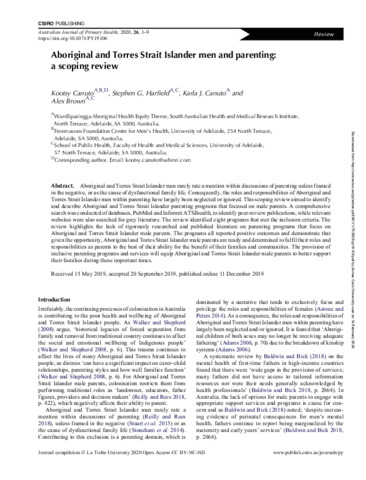 Canuto, Kootsy, Harfield, Stephen G., Canuto, Karla J., and Brown, Alex (2020) Aboriginal and Torres Strait Islander men and parenting: A scoping review. Australian Journal of Primary Health, 26 (1).