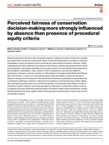 Hampton-Smith, Melissa, Gurney, Georgina G., Curnock, Matthew, Ruano-Chamorro, Cristina, and Cinner, Joshua (2025) Perceived fairness of conservation decision-making more strongly influenced by absence than presence of procedural equity criteria. npj Ocean Sustainability, 5. 4.
