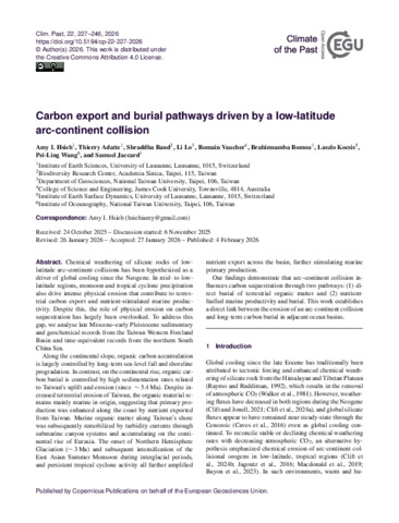Hsieh, Amy I., Adatte, Thierry, Band, Shraddha, Lo, Li, Vaucher, Romain, Bomou, Brahimsamba, Kocsis, Laszlo, Wang, Pei Ling, and Jaccard, Samuel (2026) Carbon export and burial pathways driven by a low-latitude arc-continent collision. Climate of the Past, 22 (2). pp. 227-246.
