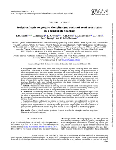 Smith, T.M., Bramwell, G., Treml, E.A., York, P.H., Macreadie, P.I., Ross, D.J., Keough, M., and Sherman, C.D.H. (2026) Isolation leads to greater clonality and reduced seed production in a temperate seagrass. Annals of Botany. (In Press)