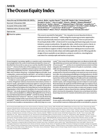 Blythe, Jessica L., Claudet, Joachim, Gill, David, Ban, Natalie C., Epstein, Graham, Gurney, Georgina G., Jupiter, Stacy D., Mahajan, Shauna L., Mangubhai, Sangeeta, Turner, Rachel, Bennett, Nathan J., D’Agata, Stéphanie, Franks, Phil, Lau, Jacqueline, Ahmadia, Gabby, Andrachuk, Mark, Annasawmy, Pavanee, Brun, Victor, Darling, Emily S., Di Franco, Antonio, Evans, Louisa, Lazzari, Natali, Naggea, Josheena, Relano, Veronica, Pertuz, Maria C., Villasante, Sebastian, and Zafra-Calvo, Noelia (2026) The Ocean Equity Index. Nature, 650. pp. 123-128.