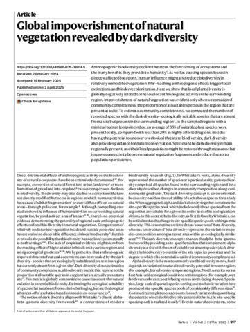 Pärtel, Meelis, Tamme, Riin, Carmona, Carlos P., Riibak, Kersti, Moora, Mari, Bennett, Jonathan A., Chiarucci, Alessandro, Chytrý, Milan, de Bello, Francesco, Eriksson, Ove, Harrison, Susan, Lewis, Robert John, Moles, Angela T., Öpik, Maarja, Price, Jodi N., Amputu, Vistorina, Askarizadeh, Diana, Atashgahi, Zohreh, Aubin, Isabelle, Azcárate, Francisco M., Barrett, Matthew D., Bashirzadeh, Maral, Bátori, Zoltán, Beenaerts, Natalie, Bergholz, Kolja, Birkeli, Kristine, Biurrun, Idoia, Blanco-Moreno, José M., Bloodworth, Kathryn J., Boisvert-Marsh, Laura, Boldgiv, Bazartseren, Brancalion, Pedro H. S., Brearley, Francis Q., Brown, Charlotte, Bueno, C. Guillermo, Buffa, Gabriella, Cahill, James F., Campos, Juan A., Cangelmi, Giacomo, Carbognani, Michele, Carcaillet, Christopher, Cerabolini, Bruno E. L., Chevalier, Richard, Clavel, Jan S., Costa, José M., Cousins, Sara A. O., Čuda, Jan, Dairel, Mariana, Dalle Fratte, Michele, Danilova, Alena, Davison, John, Deák, Balázs, Del Vecchio, Silvia, Dembicz, Iwona, Dengler, Jürgen, Dolezal, Jiri, Domene, Xavier, Dvorsky, Miroslav, Ejtehadi, Hamid, Enrico, Lucas, Epikhin, Dmitrii, Eskelinen, Anu, Essl, Franz, Fan, Gaohua, Fantinato, Edy, Fazlioglu, Fatih, Fernández-Pascual, Eduardo, Ferrara, Arianna, Fidelis, Alessandra, Fischer, Markus, Flagmeier, Maren, Forte, T’ai G. W., Fraser, Lauchlan H., Fujinuma, Junichi, Furquim, Fernando F., Garris, Berle, Garris, Heath W., Giorgis, Melisa A., Giusso del Galdo, Gianpietro, González-Robles, Ana, Good, Megan K., Guardiola, Moisès, Guarino, Riccardo, Guerrero, Irene, Guillemot, Joannès, Güler, Behlül, Guo, Yinjie, Haesen, Stef, Hejda, Martin, Heleno, Ruben H., Høye, Toke T., Hrivnák, Richard, Huang, Yingxin, Hunter, John T., Iakushenko, Dmytro, Ibáñez, Ricardo, Ingerpuu, Nele, Irl, Severin D. H., Janíková, Eva, Jansen, Florian, Jeltsch, Florian, Jentsch, Anke, Jiménez-Alfaro, Borja, Jõks, Madli, Jouri, Mohammad H., Karami, Sahar, Katal, Negin, Kelemen, András, Khairullin, Bulat I., Khuroo, Anzar A., Komatsu, Kimberly J., Konečná, Marie, Kook, Ene, Korell, Lotte, Koroleva, Natalia, Korznikov, Kirill A., Kozhevnikova, Maria V., Kozub, Łukasz, Laanisto, Lauri, Lager, Helena, Lanta, Vojtech, Lasagno, Romina G., Lembrechts, Jonas J., Li, Liping, Lisner, Aleš, Liu, Houjia, Liu, Kun, Liu, Xuhe, Lucas-Borja, Manuel Esteban, Ludewig, Kristin, Lukács, Katalin, Luther-Mosebach, Jona, Macek, Petr, Marignani, Michela, Michalet, Richard, Miglécz, Tamás, Moeslund, Jesper Erenskjold, Moeys, Karlien, Montesinos Torres, Daniel, Moreno-Jiménez, Eduardo, Moysiyenko, Ivan, Mucina, Ladislav, Muñoz-Rojas, Miriam, Murillo, Raytha A., Nambahu, Sylvia M., Neuenkamp, Lena, Normand, Signe, Nowak, Arkadiusz, Nuche, Paloma, Oja, Tatjana, Onipchenko, Vladimir G., Pachedjieva, Kalina L., Paganeli, Bruno, Peco, Begoña, Peralta, Ana M. L., Pérez-Haase, Aaron, Peri, Pablo L., Petraglia, Alessandro, Peyre, Gwendolyn, Plaza-Álvarez, Pedro Antonio, Plue, Jan, Prentice, Honor C., Prokhorov, Vadim E., Radujković, Dajana, Rahmanian, Soroor, Reitalu, Triin, Ristow, Michael, Robin, Agnès A., Robles, Ana Belén, Rodríguez Ginart, Daniel A., Román, Raúl, Roos, Ruben E., Rosati, Leonardo, Sádlo, Jiří, Salimbayeva, Karina, Sánchez de Dios, Rut, Sanchir, Khaliun, Sattler, Cornelia, Scasta, John D., Schmiedel, Ute, Schrader, Julian, Schultz, Nick L., Sellan, Giacomo, Serra-Diaz, Josep M., Silan, Giulia, Skálová, Hana, Skobel, Nadiia, Sonkoly, Judit, Štajerová, Kateřina, Svitková, Ivana, Świerszcz, Sebastian, Tanentzap, Andrew J., Tanentzap, Fallon M., Tarifa, Rubén, Tejero, Pablo, Tekeev, Dzhamal K., Tholin, Michael, Thormodsæter, Ruben S., Tian, Yichen, Tokaryuk, Alla, Tölgyesi, Csaba, Tomaselli, Marcello, Tordoni, Enrico, Török, Péter, Tóthmérész, Béla, Toussaint, Aurèle, Touzard, Blaise, Trindade, Diego P. F., Tsakalos, James L., Türkiş, Sevda, Valencia, Enrique, Valerio, Mercedes, Valkó, Orsolya, Van Meerbeek, Koenraad, Vandvik, Vigdis, Villellas, Jesus, Virtanen, Risto, Vítková, Michaela, Vojík, Martin, von Hessberg, Andreas, von Oppen, Jonathan, Wagner, Viktoria, Wan, Ji-Zhong, Wang, Chun-Jing, Wani, Sajad A., Weiss, Lina, Wevill, Tricia, Xiao, Sa, Zárate Martínez, Oscar, and Zobel, Martin (2025) Global impoverishment of natural vegetation revealed by dark diversity. Nature, 641. pp. 917-924.