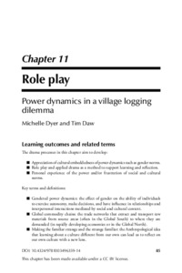 This chapter outlines a role play in which students take part in a meeting in a Solomon Islands village, where the meeting participants discuss whether to allow an international logging company to log their customary lands. The role play highlights how globally interconnected commodity chains intersect with cultural power dynamics, in this case, gendered power dynamics in combination with customary land tenure rules. After a warm-up, each student receives instructions on whether they are for or against the logging application and how they are allowed to behave in the meeting (based on a hierarchy of speaking underpinned by the intersection of gender, kinship, and rights to the land in question). However not all is revealed to the students and they have to figure it out during the debrief, to emphasise the taken-for-granted impact of identities, especially such as gender, on social relations and power.