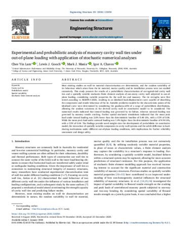 Lam, Chee Yin, Gooch, Lewis J., Masia, Mark J., and Chaves, Igor A. (2026) Experimental and probabilistic analysis of masonry cavity wall ties under out-of-plane loading with application of stochastic numerical analyses. Engineering Structures, 351. 122050.