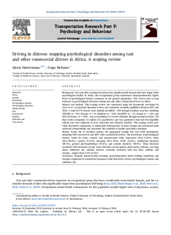 Harerimana, Alexis, and Mchunu, Gugu (2026) Driving in distress: mapping psychological disorders among taxi and other commercial drivers in Africa. A scoping review. Transportation Research Part F, 119. 103570.
