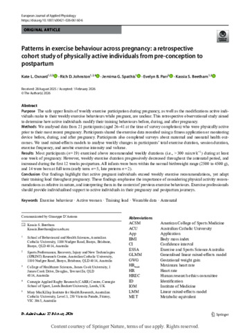 Oxnard, Kate L., Johnston, Rich D., Spathis, Jemima G., Parr, Evelyn B., and Beetham, Kassia S. (2026) Patterns in exercise behaviour across pregnancy: a retrospective cohort study of physically active individuals from pre-conception to postpartum. European Journal of Applied Physiology. (In Press)