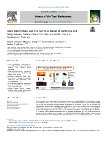 Manchal, Naveen, Young, Megan, Castellanos, Maria Eugenia, and Adegboye, Oyelola A. (2026) Rising temperatures and heat waves as drivers of Salmonella and Campylobacter bacteraemia across diverse climatic zones in Queensland, Australia. Science of the Total Environment, 1023. 181610.