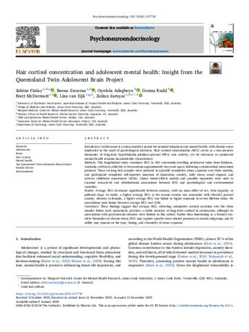 Finlay, Sabine, Suvarna, Beena, Adegboye, Oyelola, Rudd, Donna, McDermott, Brett, van Eijk, Liza, and Sarnyai, Zoltan (2026) Hair cortisol concentration and adolescent mental health: Insight from the Queensland Twin Adolescent Brain Project. Psychoneuroendocrinology, 185. 107730.