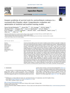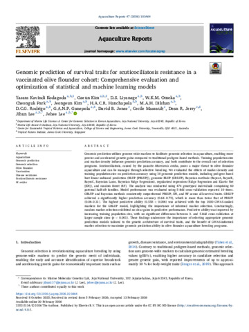 Kodagoda, Yasara Kavindi, Kim, Gaeun, Liyanage, D.S., Omeka, W.K.M., Park, Cheonguk, Kim, Jeongeun, Hanchapola, H.A.C.R., Dilshan, M A.H., Rodrigo, D.C.G., Ganepola, G A.N.P., Jones, David B., Massault, Cecile, Jerry, Dean R., Lee, Jihun, and Lee, Jehee (2026) Genomic prediction of survival traits for scuticociliatosis resistance in a vaccinated olive flounder cohort: Comprehensive evaluation and optimization of statistical and machine learning models. Aquaculture Reports, 47. 103464.