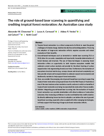 Cheesman, Alexander W., Cernusak, Lucas A., Yatsko, Abbey R., Calvert, Jed, and Cook, Keith (2026) The role of ground-based laser scanning in quantifying and crediting tropical forest restoration: An Australian case study. Ecological Solutions and Evidence, 7. e70213.