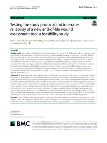 Conclusions Assessing for EOL wounds in dying patients is a clinical imperative. With minor study protocol adjustments, such as having two clinicians concurrently undertake independent wound assessment and only recruiting from palliative care units, conducting a larger multisite study testing the inter- and intrarater reliability of the new EOL wound assessment tool is feasible.