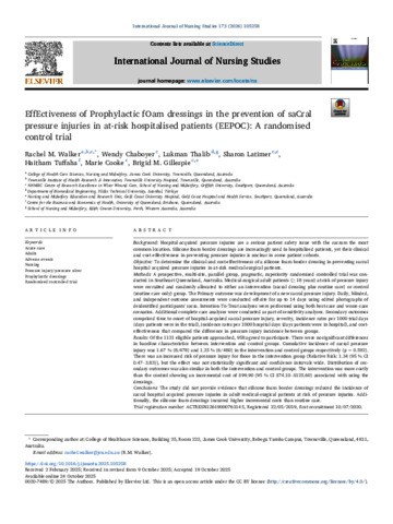 Walker, Rachel M., Chaboyer, Wendy, Thalib, Lukman, Latimer, Sharon, Tuffaha, Haitham, Cooke, Marie, and Gillespie, Brigid M. (2026) EffEctiveness of Prophylactive fOam dressings in the prevention of saCral pressure injuries in at-risk hospitalised patients (EEPOC): A randomised control trial. International Journal of Nursing Studies, 173. 105258.
