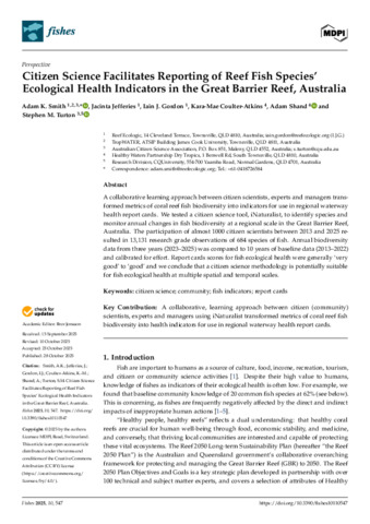 Smith, Adam K., Jefferies, Jacinta, Gordon, Iain J., Coulter-Atkins, Kara-Mae, Shand, Adam, and Turton, Stephen M. (2025) Citizen Science Facilitates Reporting of Reef Fish Species’ Ecological Health Indicators in the Great Barrier Reef, Australia. Fishes, 10 (11). 547.