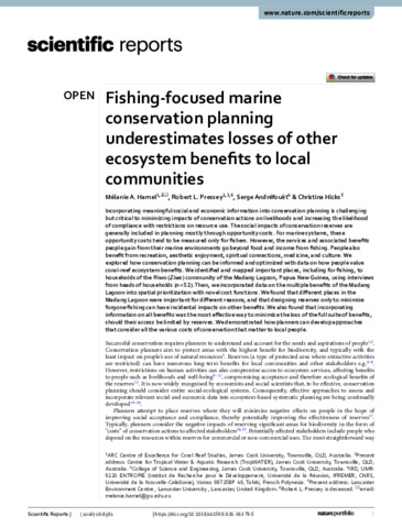 Hamel, Melanie A., Pressey, Robert L., Andrefouet, Serge, and Hicks, Christina (2026) Fishing-focused marine conservation planning underestimates losses of other ecosystem benefits to local communities. Scientific Reports, 16. 6381.
