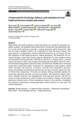 Green, Elyce, Quilliam, Claire, Seaton, Catherine, Ferns, Jane, Ridd, Melissa, Sheepway, Lyndal, Moore, Leigh, Bailie, Jodie, Rasiah, Rohan L., Taylor, Carolyn, Fitzgerald, Kathryn W., and Debenham, James (2026) A framework for the design, delivery, and evaluation of rural health professions student placements. Advances in Health Sciences Education. (In Press)