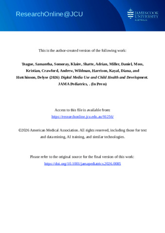 Teague, Samantha, Somoray, Klaire, Shatte, Adrian, Miller, Daniel, Moss, Kristian, Crawford, Andrew, Wildman, Harrison, Kayal, Diana, and Hutchinson, Delyse (2026) Digital Media Use and Child Health and Development. JAMA Pediatrics. (In Press)