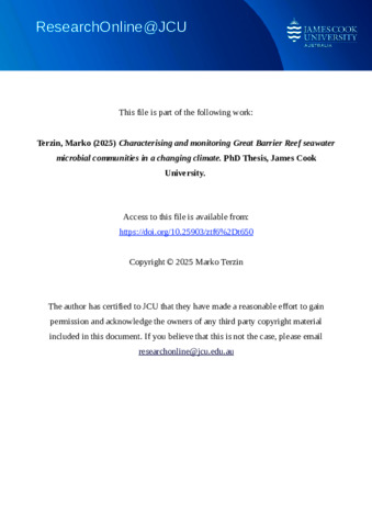 Terzin, Marko (2025) Characterising and monitoring Great Barrier Reef seawater microbial communities in a changing climate. PhD thesis, James Cook University.