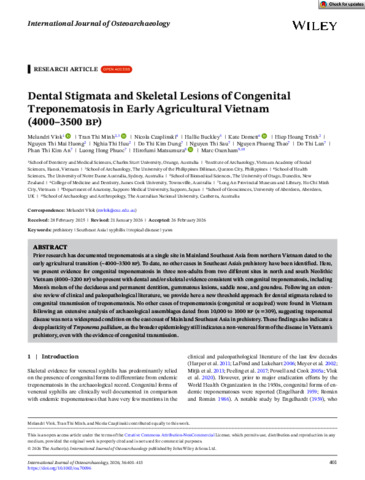 Vlok, Melandri, Minh, Tran, Caplinski, Nicola, Buckley, Hallie, Domett, Kate, Trinh, Hoang, Huu, Nghia, Dung, Do Thi Kim, Sau, Nguyen Thi, Lan, Do Thi, Phuoc, Luong Hong, Matsumura, Hirofumi, and Oxenham, Marc (2026) Dental Stigmata and Skeletal Lesions of Congenital Treponematosis in Early Agricultural Vietnam (4000–3500 bp). International Journal of Osteoarchaeology, 36 (2). pp. 401-413.