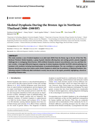 Kaoboriboon, Nuttheera, Tayles, Nancy, Villaluz, Sarah Agatha, Yuwono, Pratiwi, Domett, Kate, and Vlok, Melandri (2026) Skeletal Dysplasia During the Bronze Age in Northeast Thailand (3000–2500 BP). International Journal of Osteoarchaeology, 36 (2). pp. 318-324.
