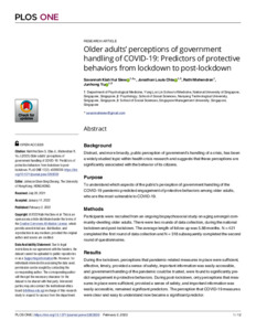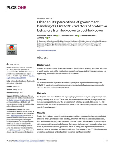 Kiah, Savannah Kiah Siew, Chia, Jonathan Lpuis, Mahendran, Rathi, and Yu, Junhong (2022) Older adults’ perceptions of government handling of COVID-19: Predictors of protective behaviors from lockdown to post-lockdown. PLoS ONE, 17 (2). e0263039.